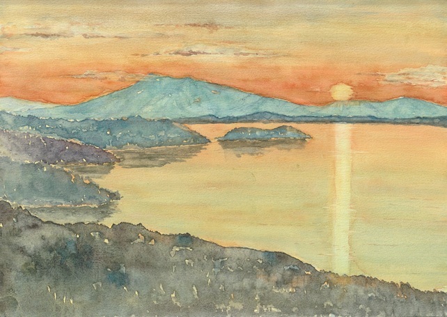 北海道、屈斜路湖の夕暮れを描いてみました。画面が暗いせいか平坦に見えますねぇ(´・ω・`)