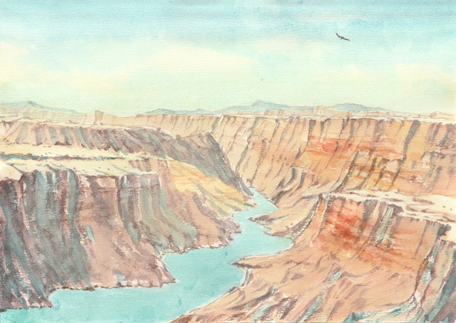 アメリカのグランドキャニオンを描いてみました。構図が不安定な感じがするので右のほうの崖をもうち右上がりにした方が良かったですね。