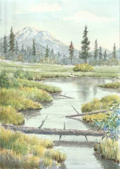 アメリカ、ワシントン州のレーニアの山を描いてみました。中景を描きこみ過ぎて少しうるさい感じになりました。